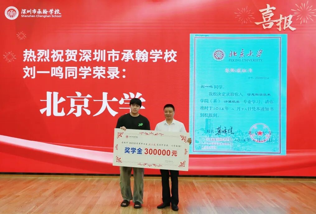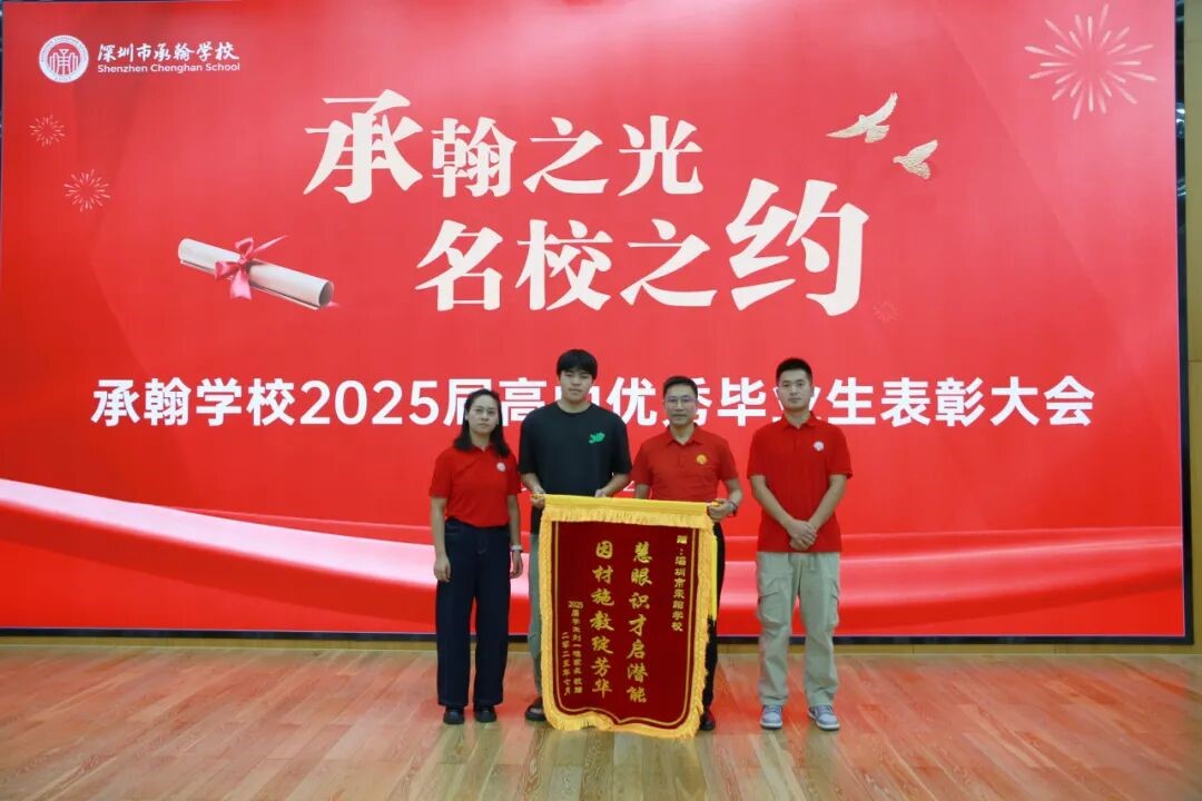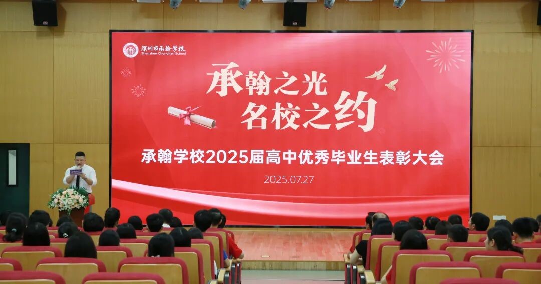 7月27日上午,深圳市承翰学校隆重举行了“承翰之光·名校之约”2025届高中优秀毕业生表彰大会。承翰集团董事长庄小夸、副总裁彭颖、办公室主任刘意,承翰教育公司执行董事庄彦莉、教育总监康晓华、副总经理何明丰,承翰学校党支部书记谈春华、西校区执行校长李银、东校区执行校长刘永明等领导与师生、家长齐聚西校区二楼报告厅,共同见证了优秀学子们的荣耀时刻,见证了学校办学成绩的新突破——刘一鸣同学以高考664分的优异成绩被北京大学录取,实现我校北大录取“零的突破”。