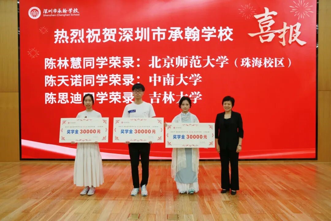 承翰集团副总裁、承翰公益慈善基金会理事长彭颖为陈林慧、陈天诺和陈思迪三位同学颁发“985名校奖学金”。陈林慧、陈天诺和陈思迪三位同学分别被北京师范大学(珠海校区)、中南大学、吉林大学录取。