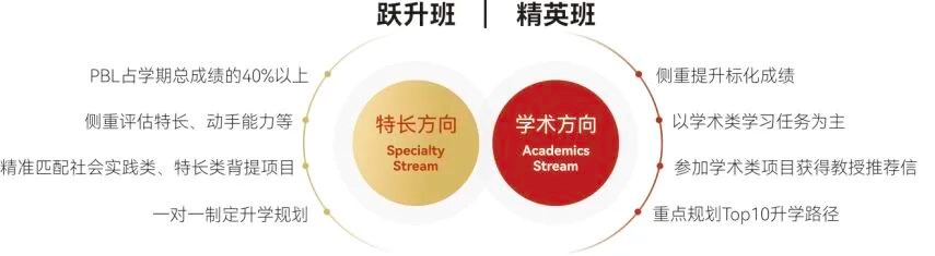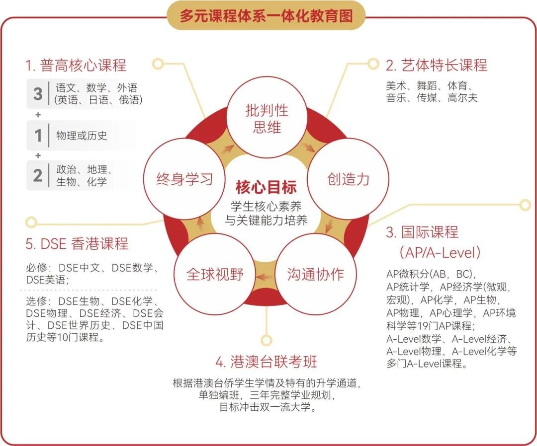 构建"核心素养奠基+多元路径拓展”的人才培养新格局,普高核心课程+港澳台联考班+艺体特长课程+国际课程(AP/A-LEVEL)+香港DSE课程+社团拓展课程的多元课程体系,让学生核心素养和关键能力落地;通过跨学科选课、生涯规划指导、定制个性化学习辅导方案等机制,真正实现"一生一方案,成长不设限”,为学生的个性化成长和多元成才提供精准匹配需求。