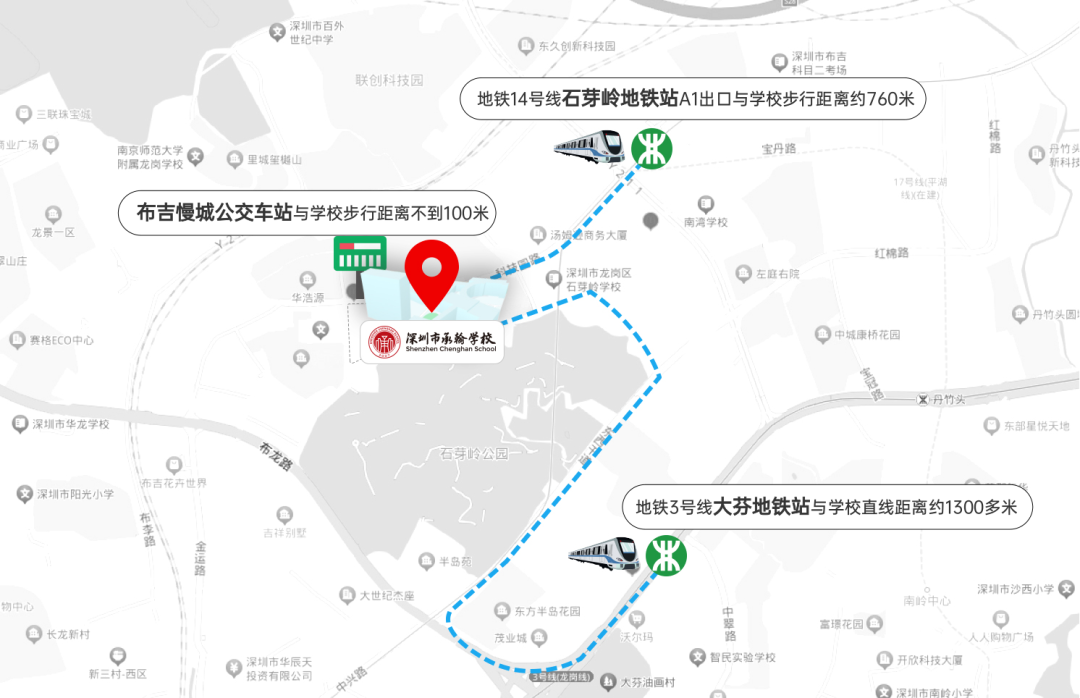 公交:乘坐M141、M203、M224、M281、M363、M403、M585路在“布吉慢城”公交站下车即可到达学校。
